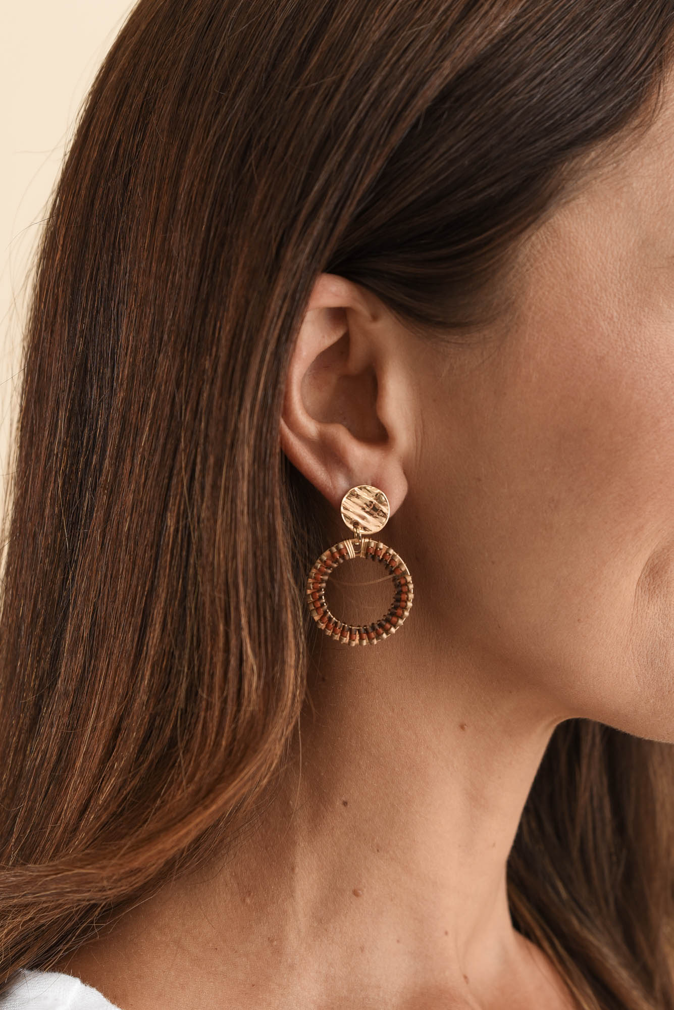 Add some sophistication with these rounded beaded drop earrings in brown tones and bright gold