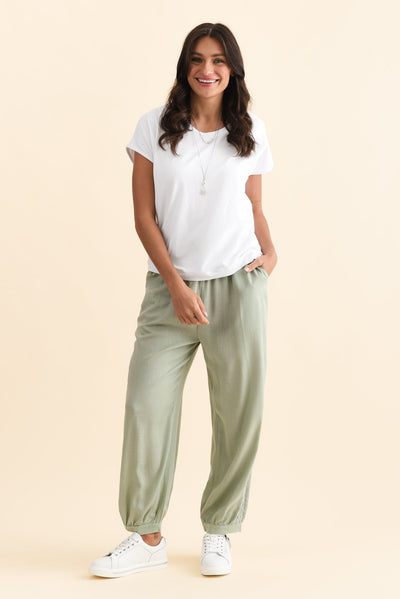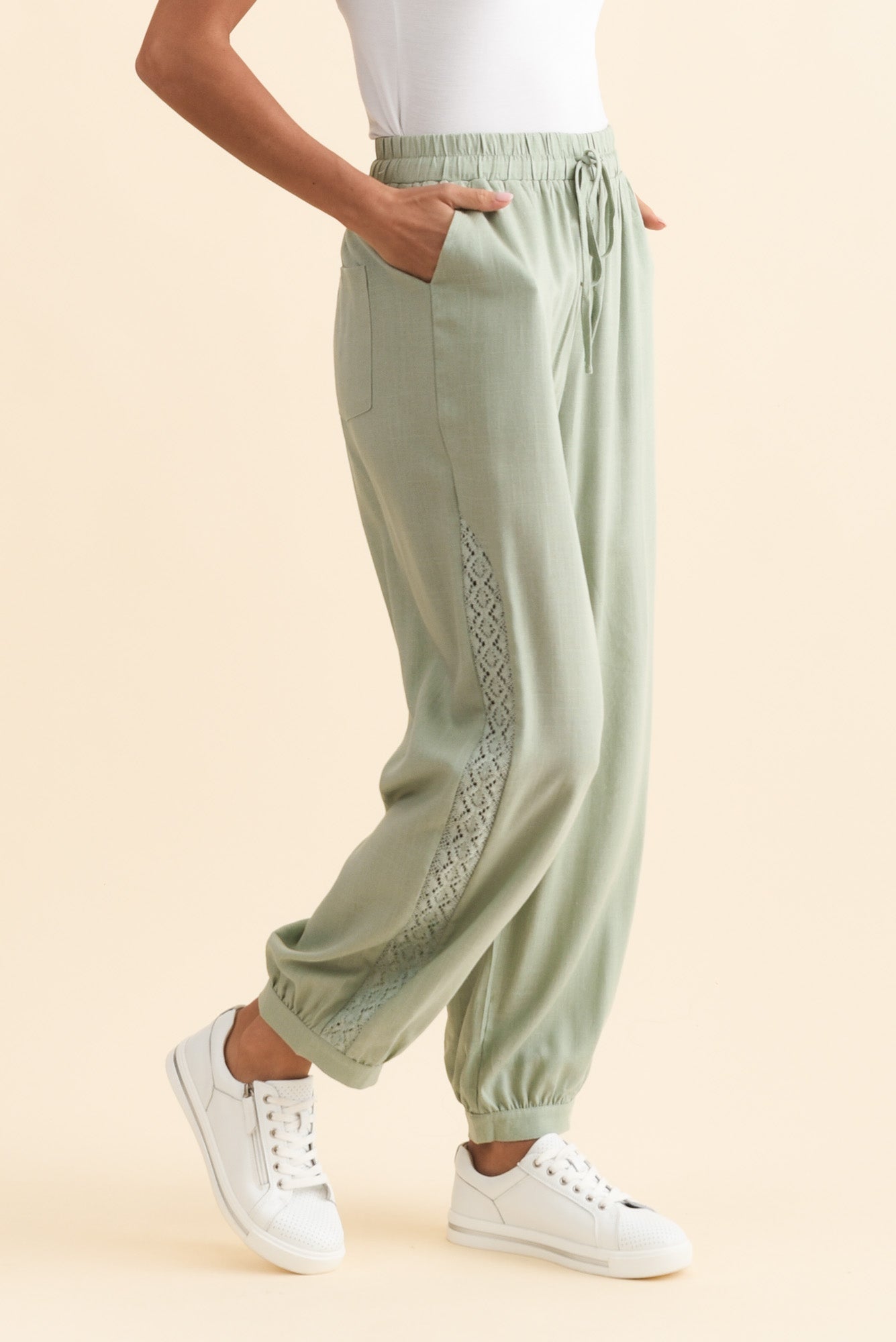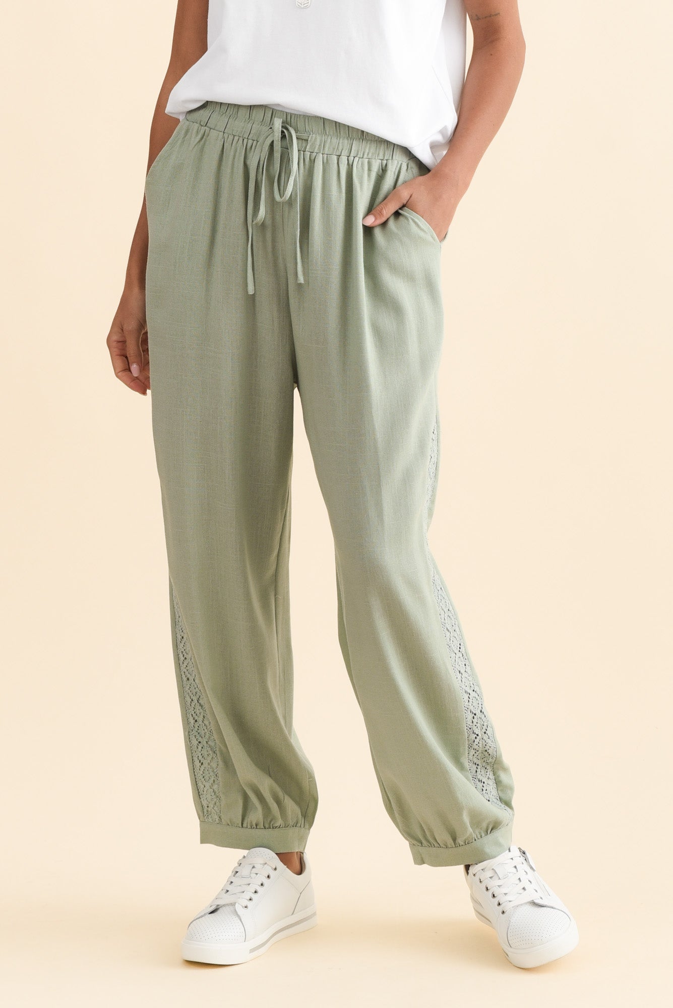 - Crafted from a soft, breathable linen blend, these pants are detailed with delicate lace accents for a chic, feminine touch