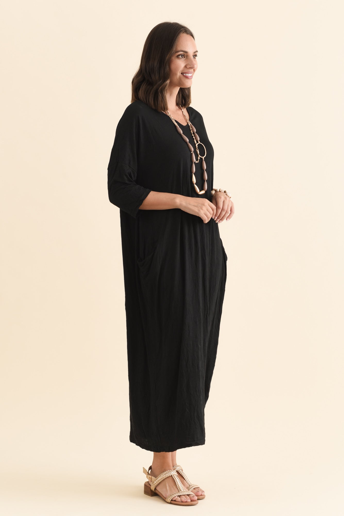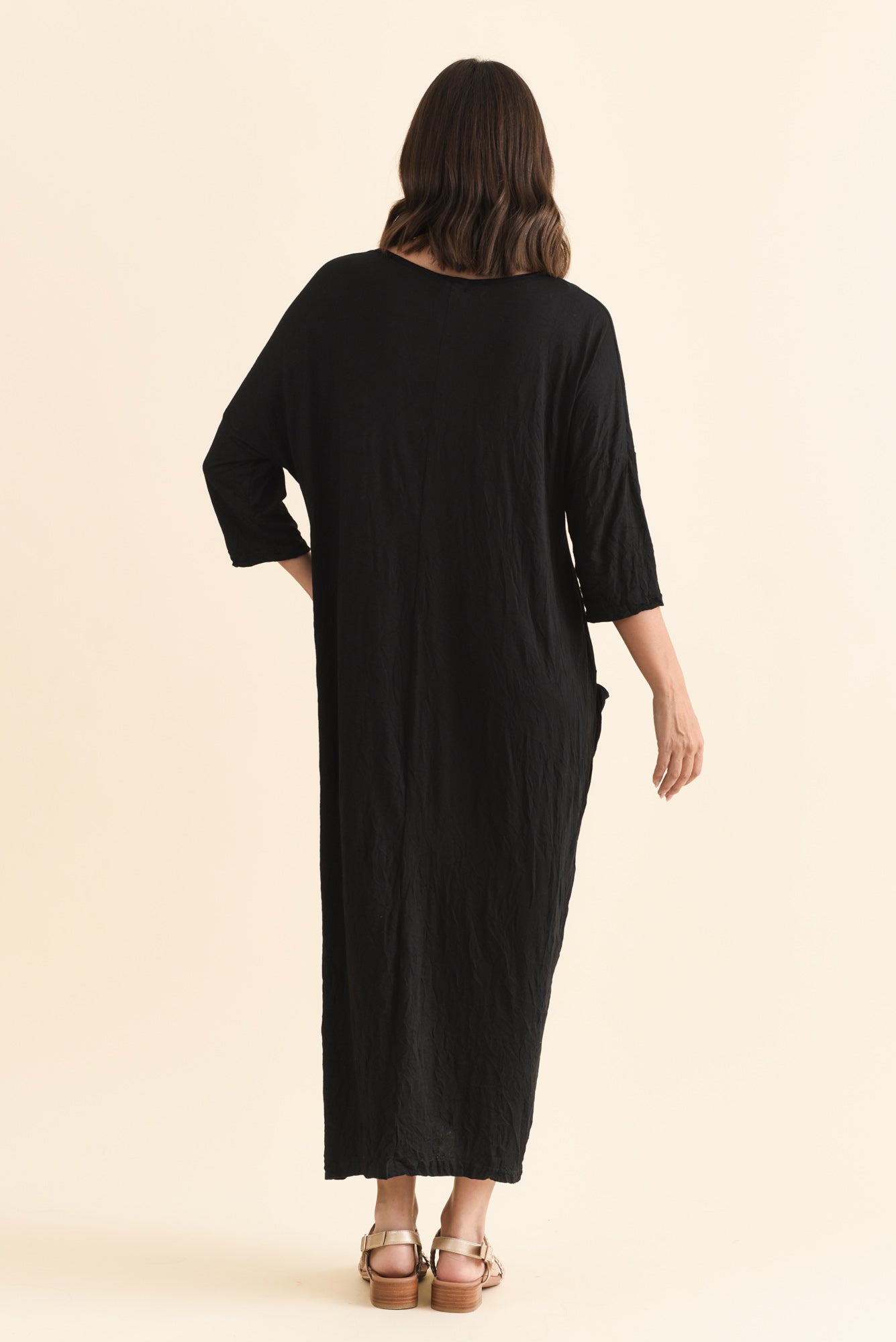 TRAVEL BLACK CRINKLE COTTON SLEEVED MAXI DRESS