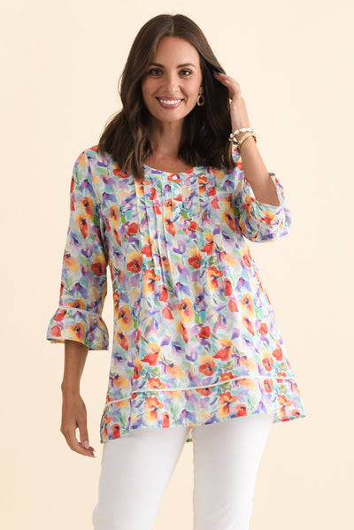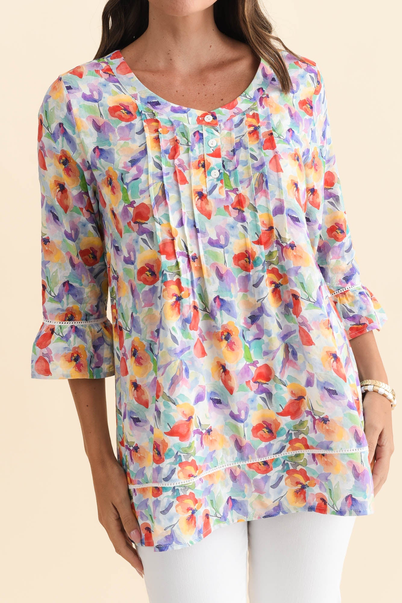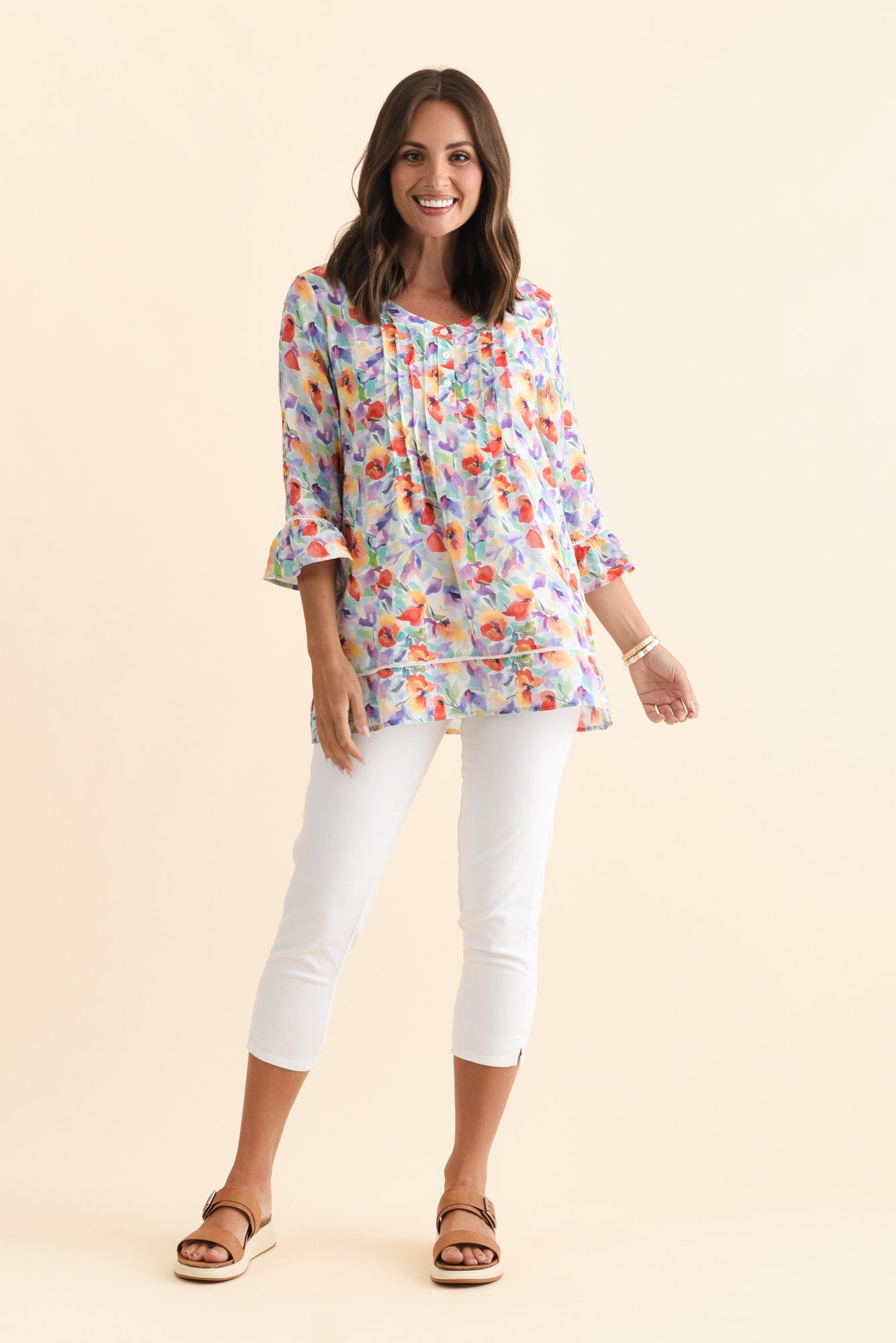 - 3/4-length straight sleeves are finished with gentle frilled cuffs
