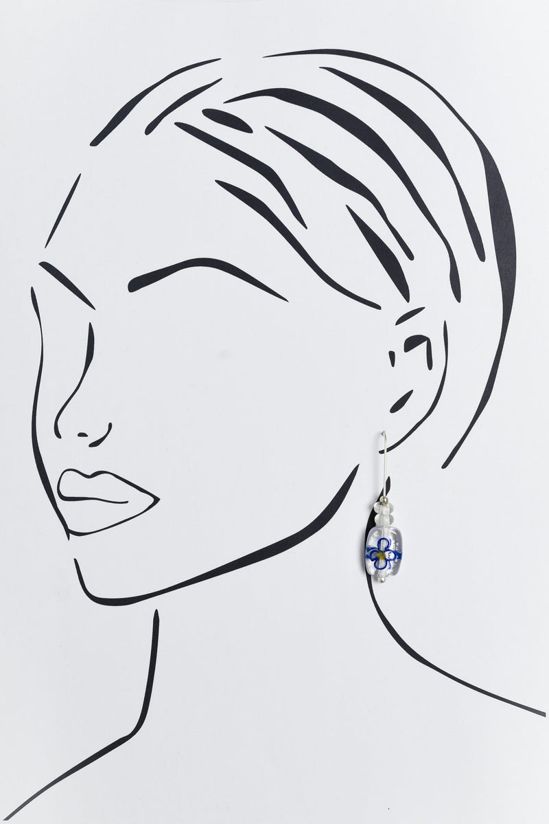 A dainty glass flower bead hangs from sleek metal hooks, boasting a timeless silver design and see-through backing