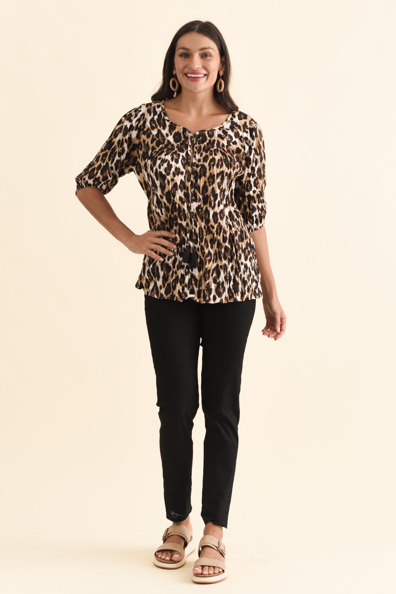 The rounded neckline flows into a cheeky V-split with an adjustable tie