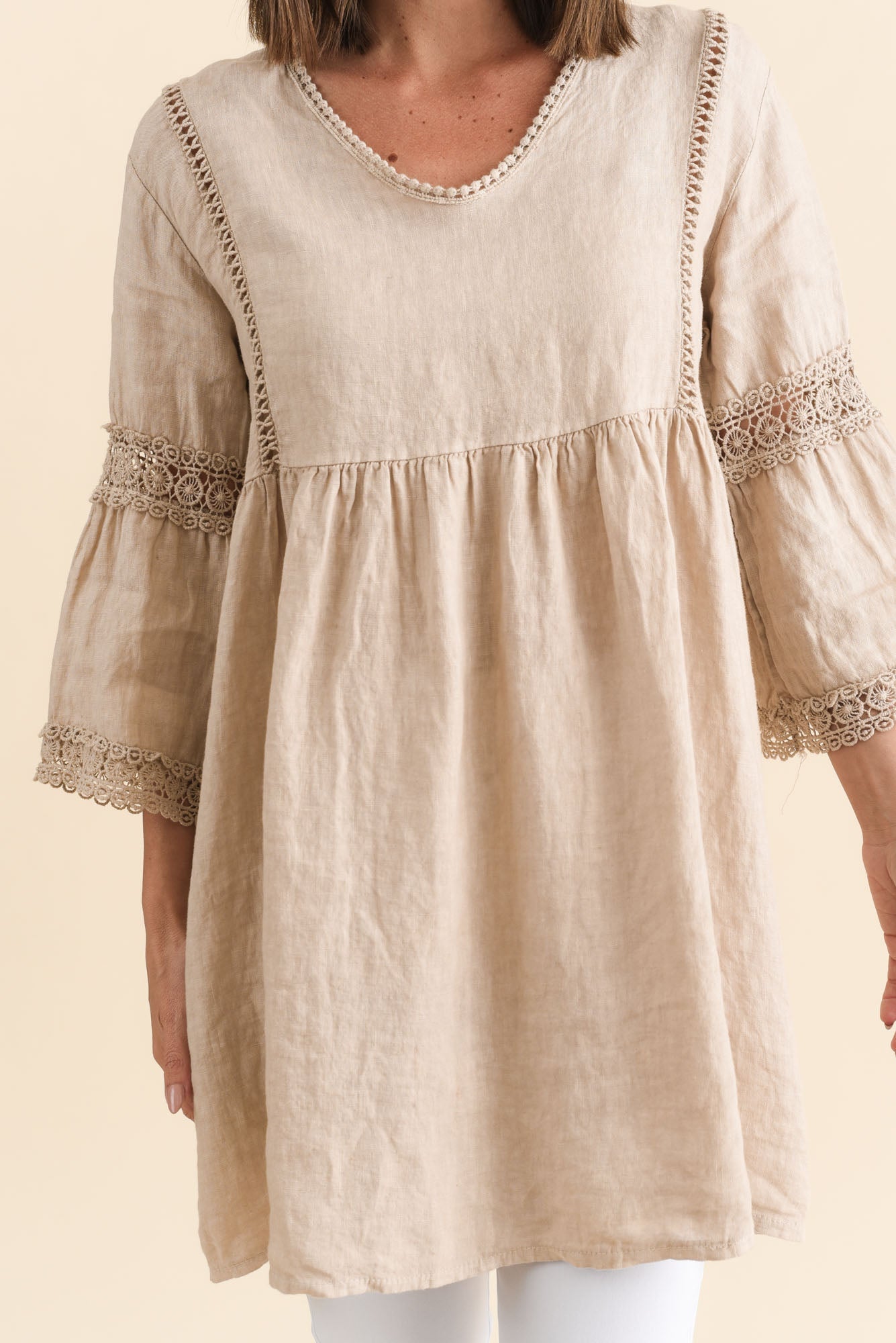 3/4 sleeves feature finely crafted, intricate crochet trim that adds an elegant and refined finish