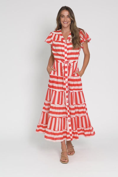 Delilah Red Stripe Cotton Tiered Dress