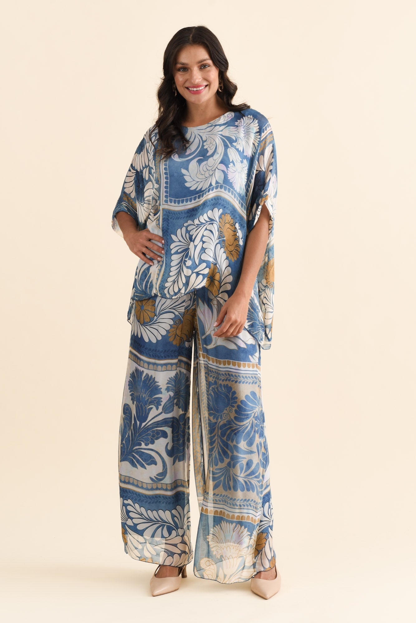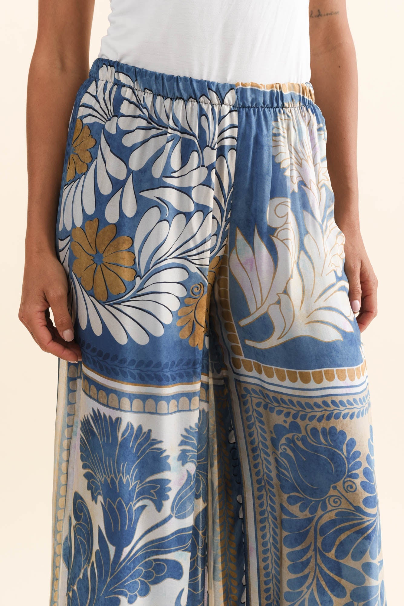 ENID BLUE BOTANICAL SILK PANTS