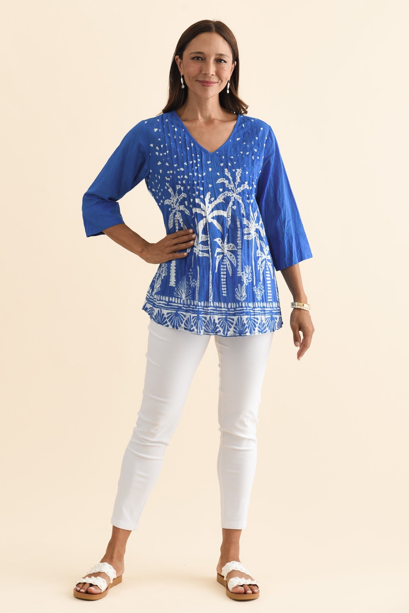 Fia Cobalt Palm Sleeved Crinkle Cotton Top