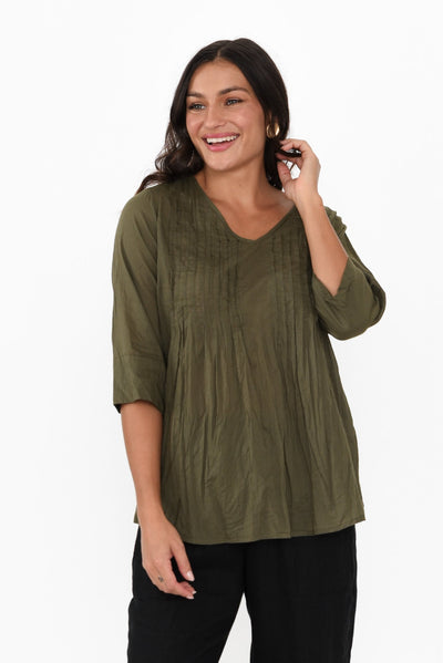 FIA KHAKI SLEEVED CRINKLE COTTON TOP