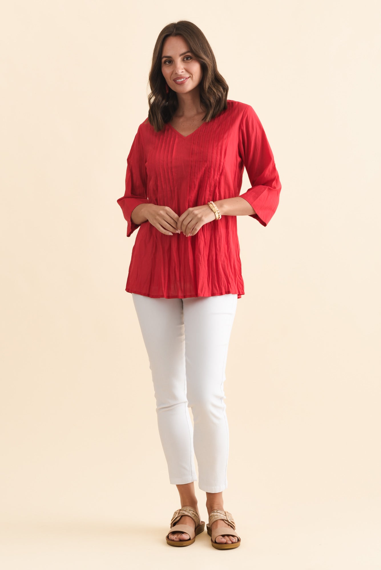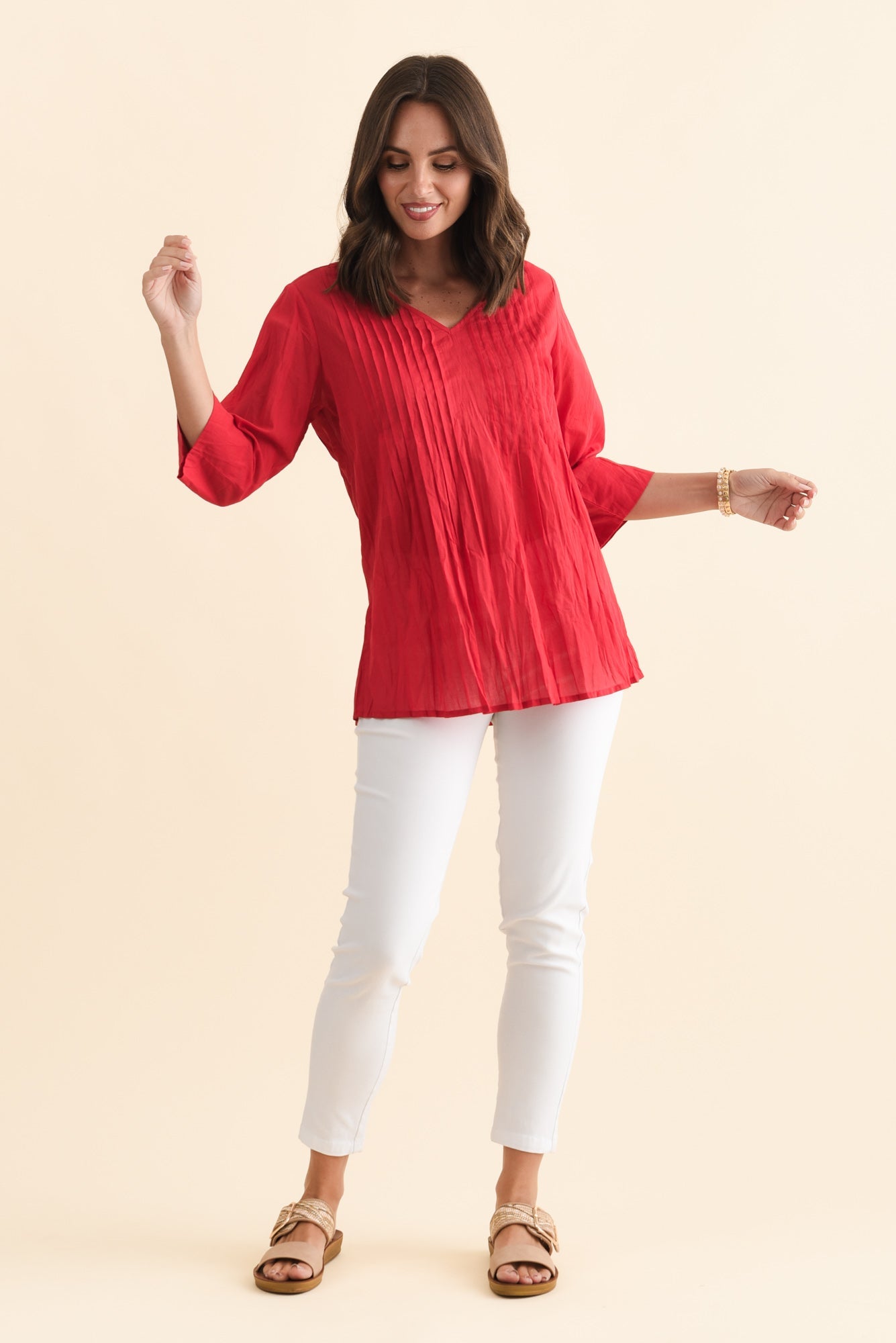 Fia Red Sleeved Crinkle Cotton Top