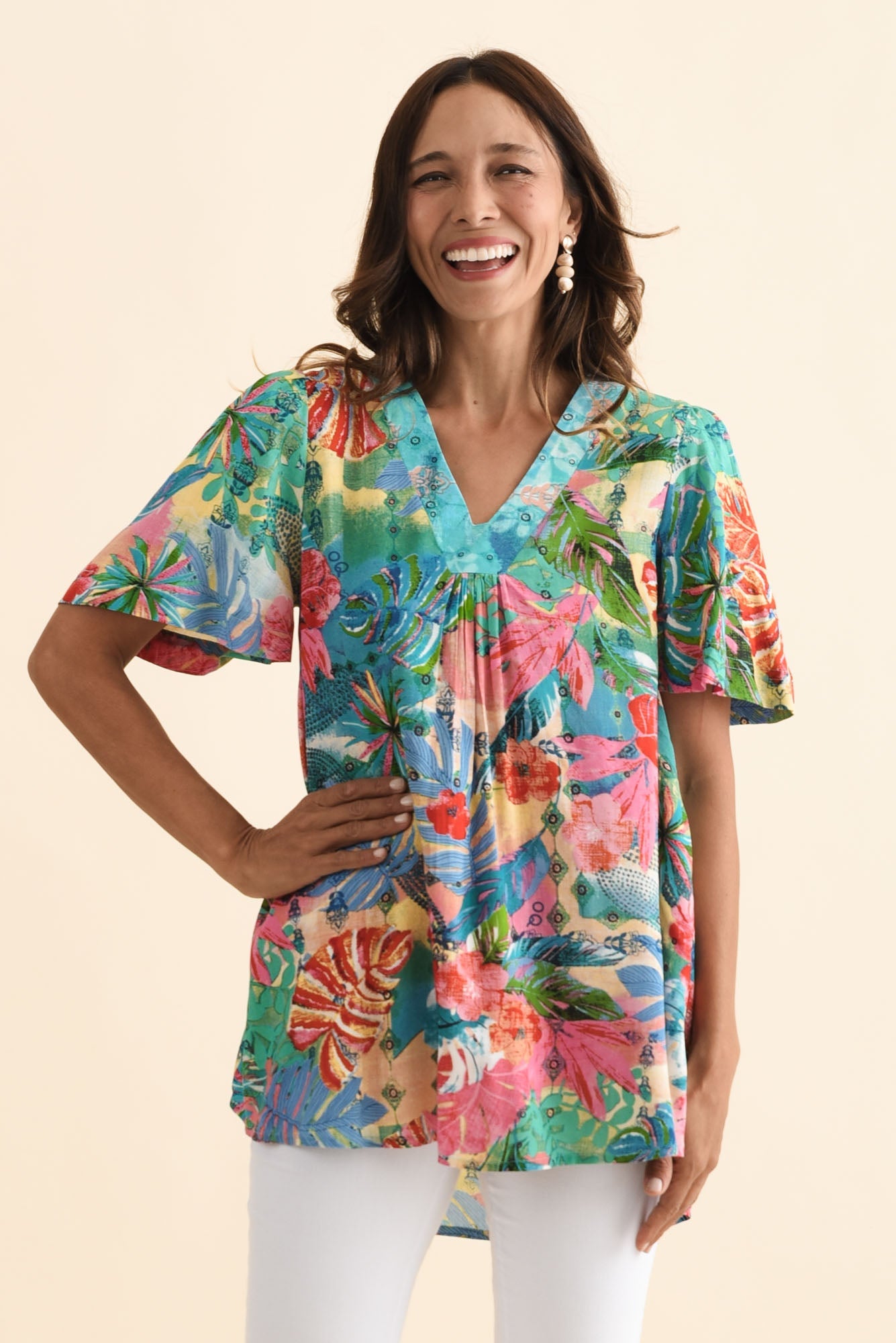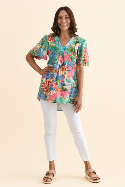 FROLIC BLUE TROPICAL FLUTTER SLEEVE TOP