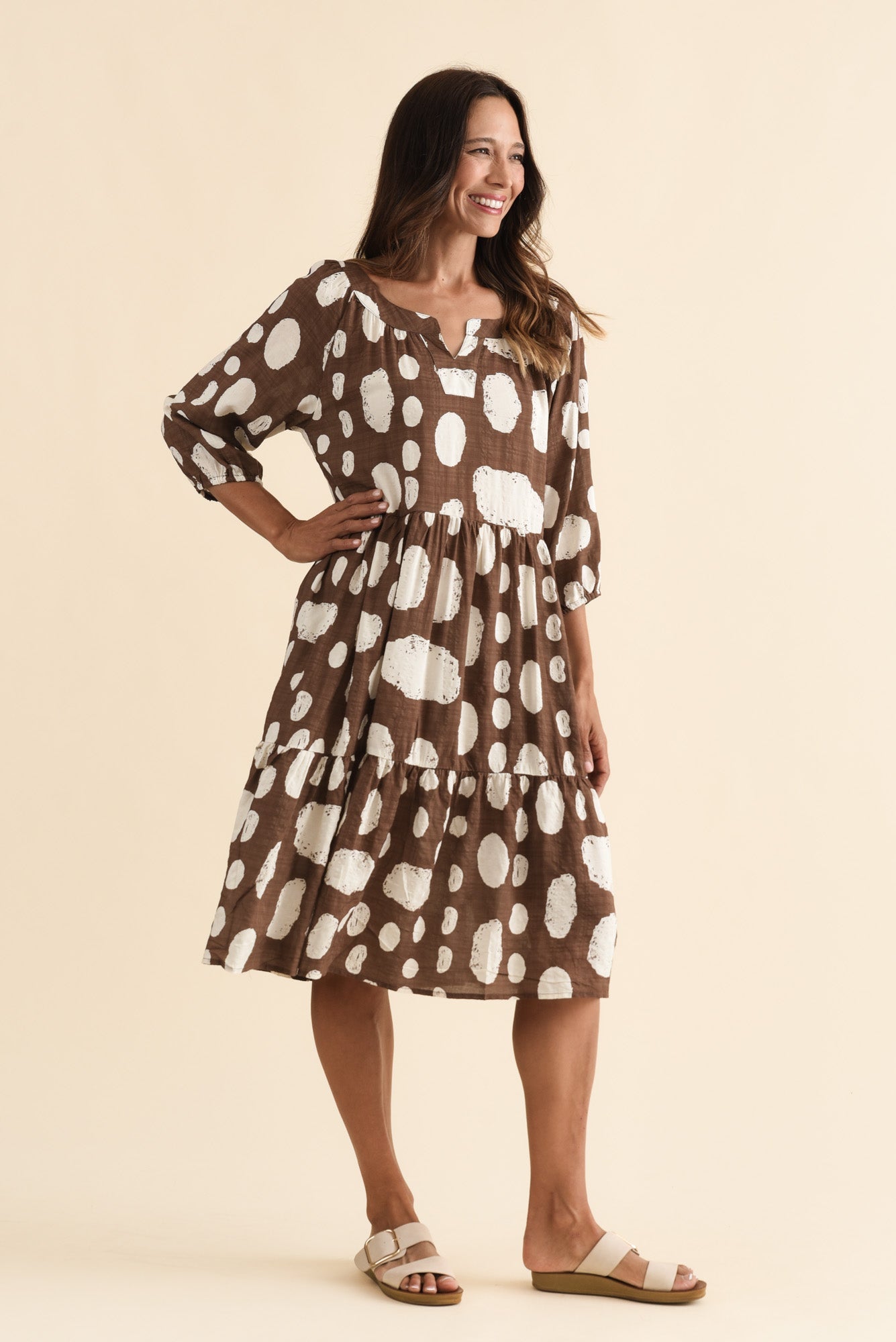 IRENE CHOCOLATE SPOT COTTON BLEND DRESS