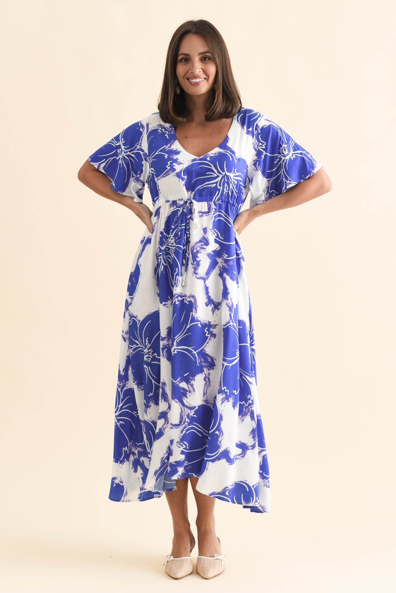 JENNIFER BLUE FLORAL FLUTTER SLEEVE DRESS