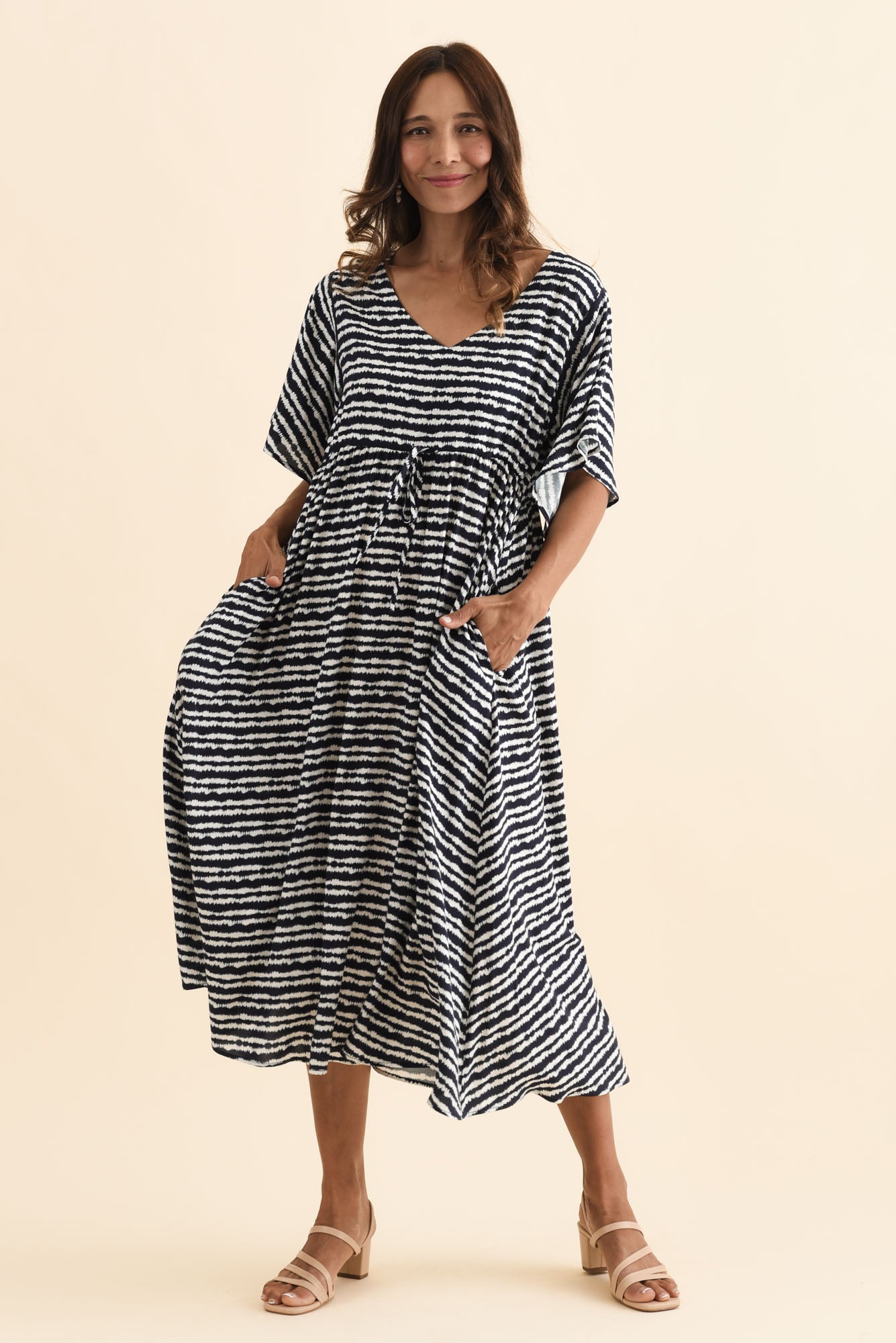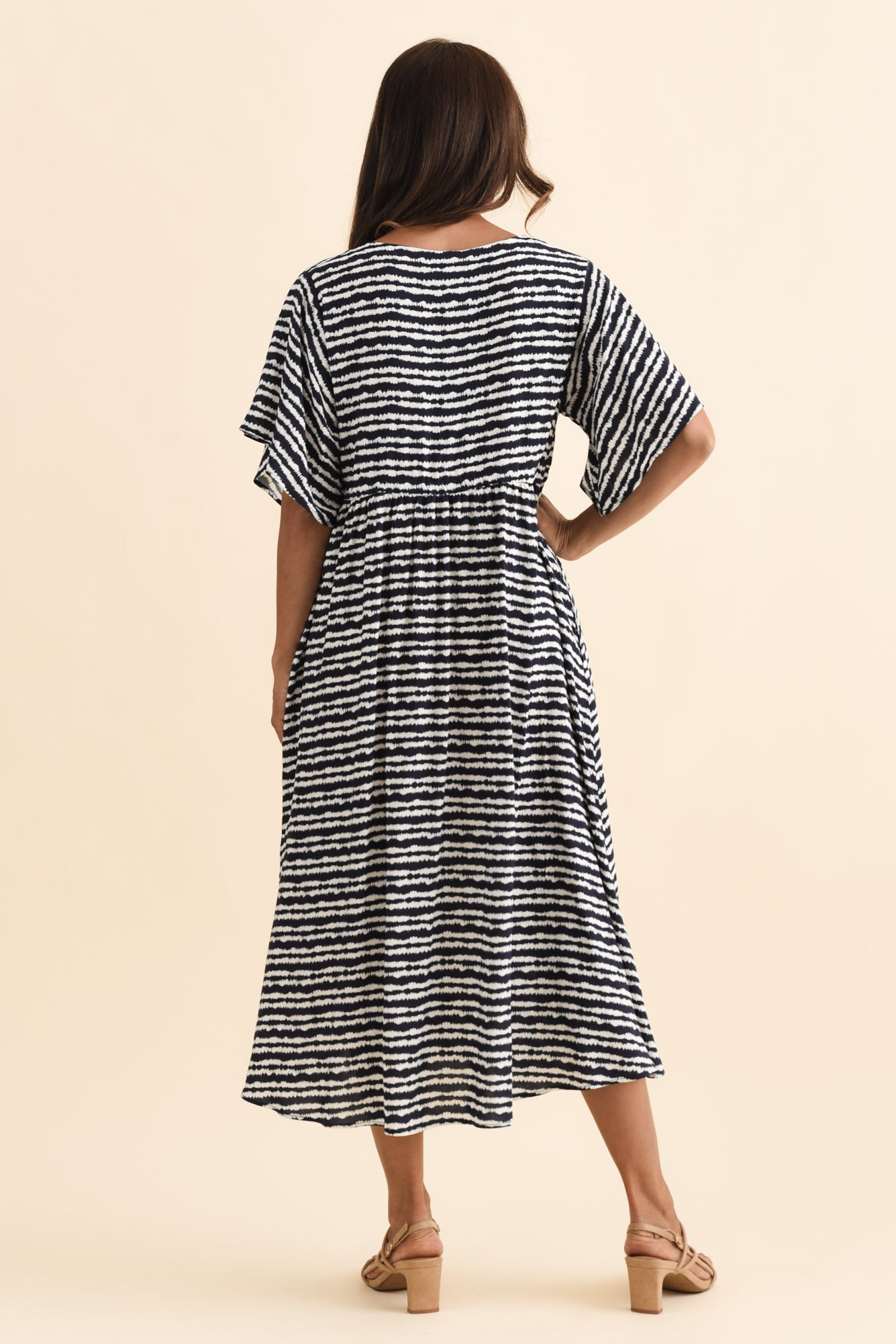 JENNIFER NAVY STRIPE FLUTTER SLEEVE DRESS