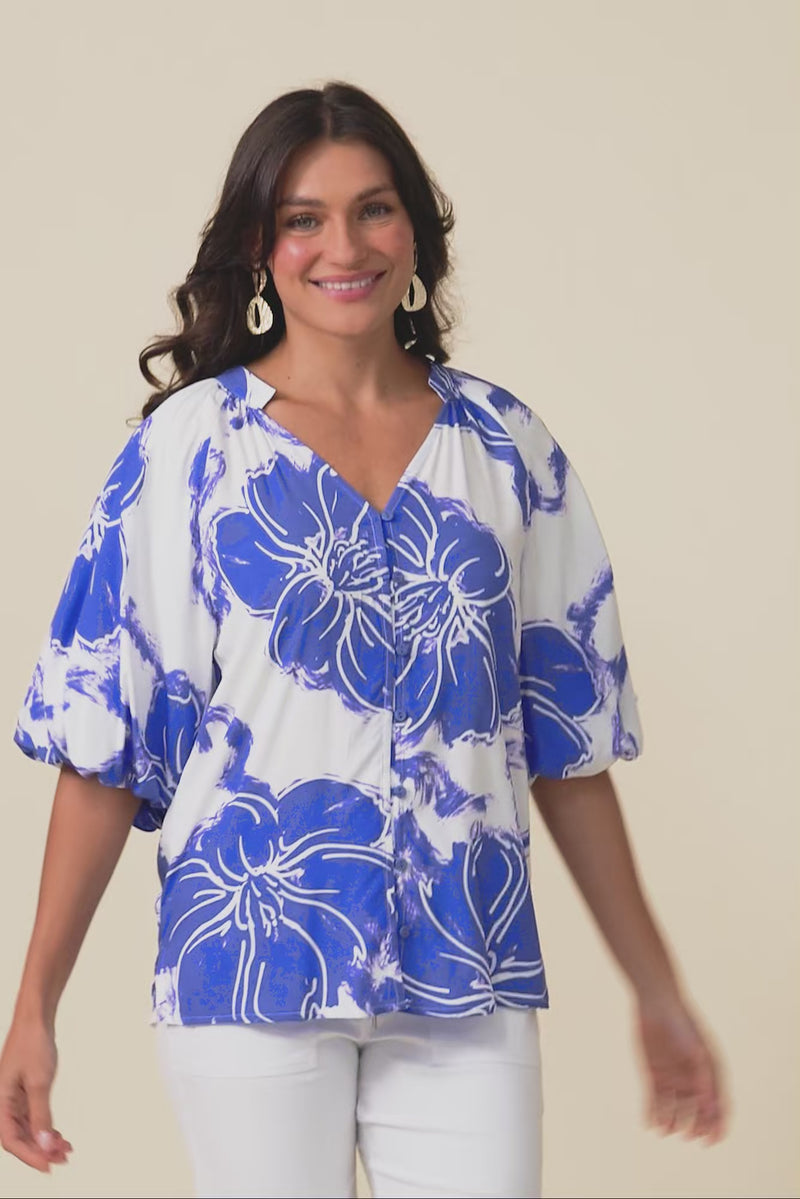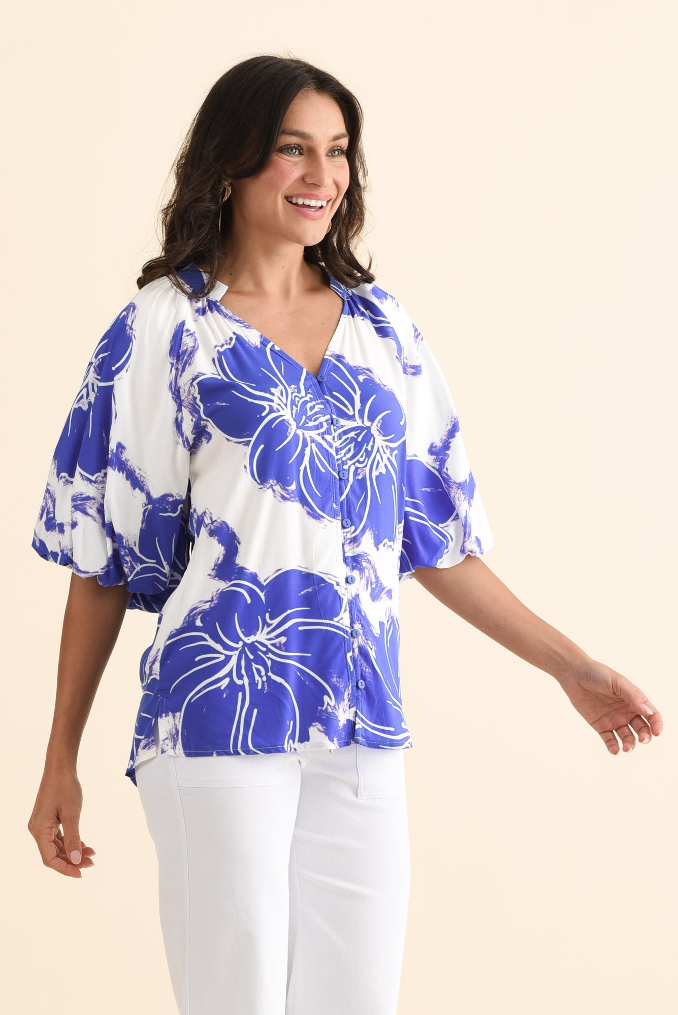Jewel Cobalt Flower Puff Sleeve Blouse
