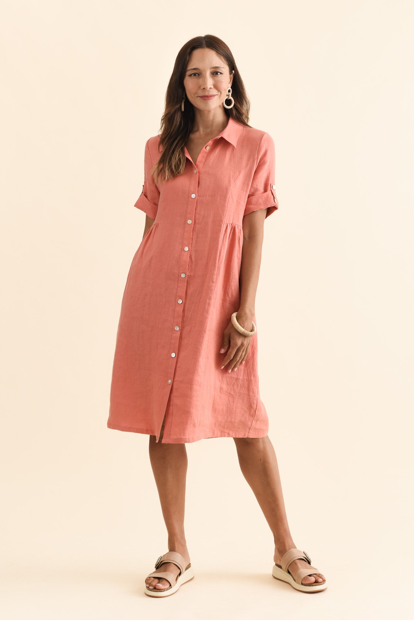 Crafted of 100% Linen, this dress is beautifully structured yet lightweight, finished with soft, feminine touches that elevate its classic appeal