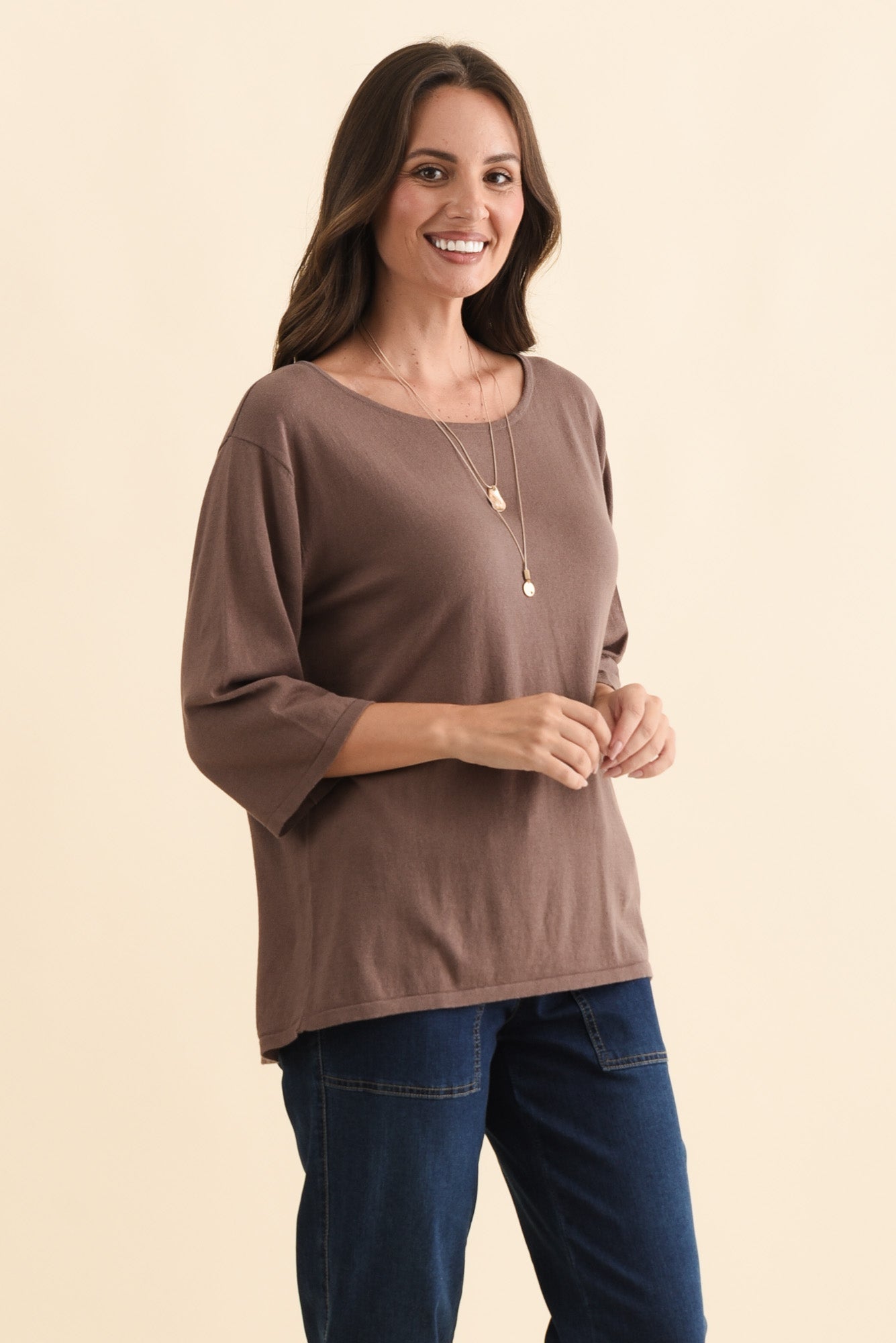 Relaxed 3/4 sleeves extend past the elbows in a straight, easy silhouette