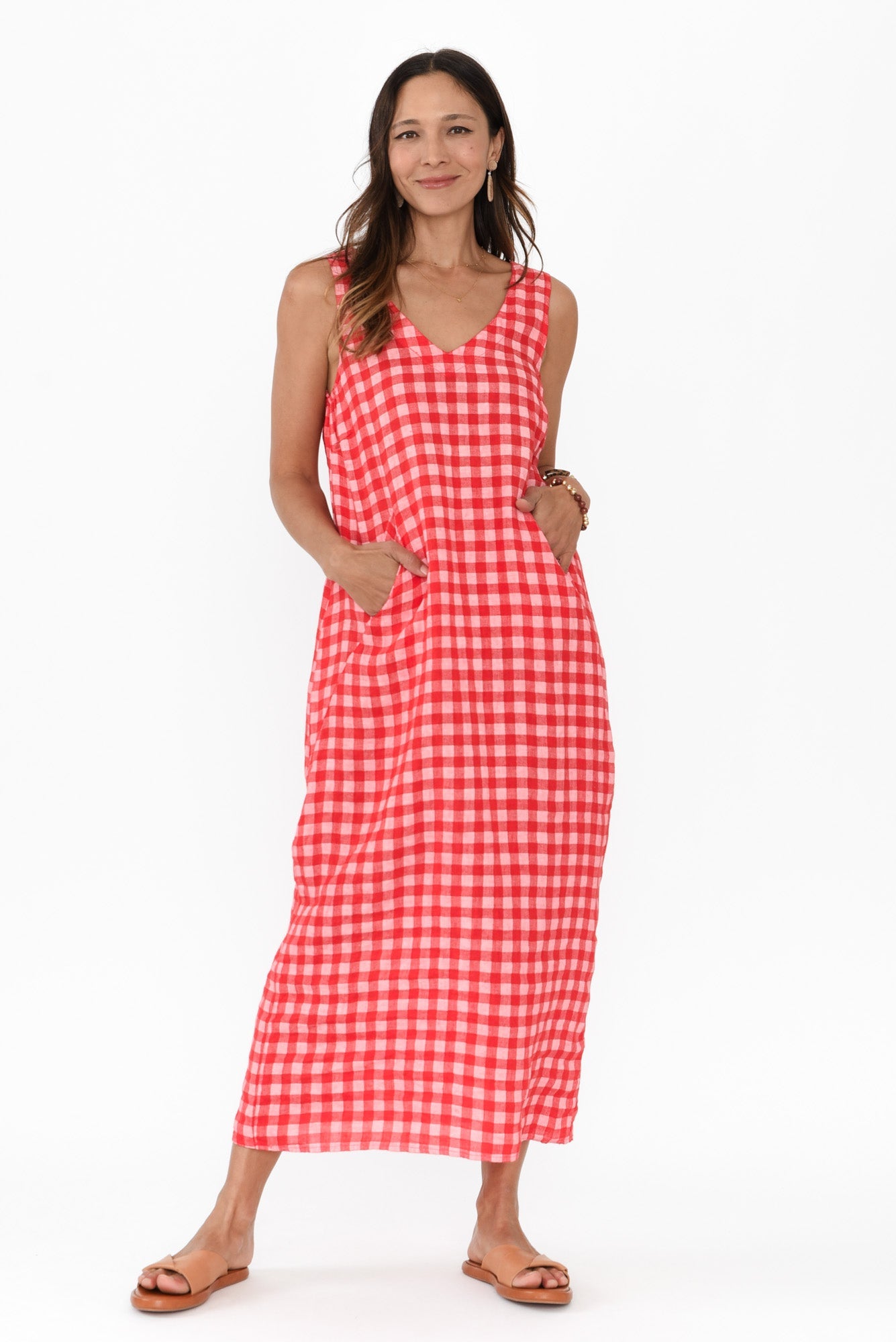 Lisa Red Check Linen Pocket Dress