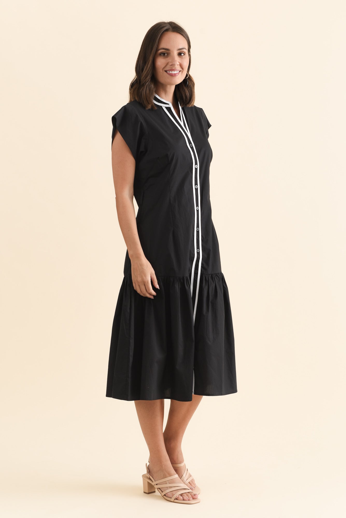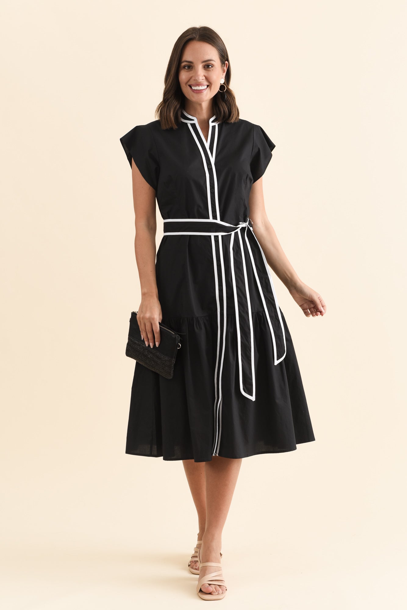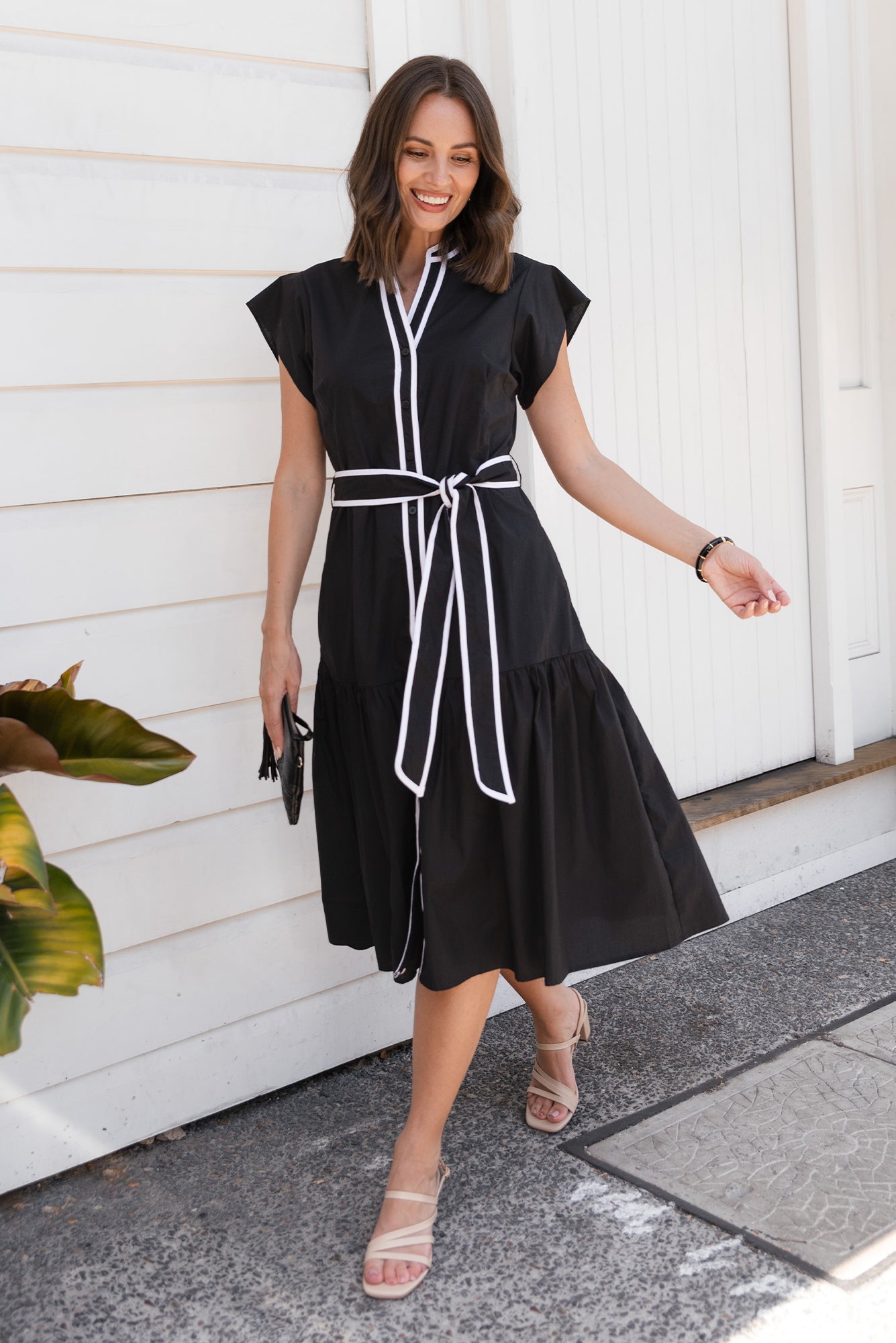 Mari Black Contrast Cotton Tie Dress