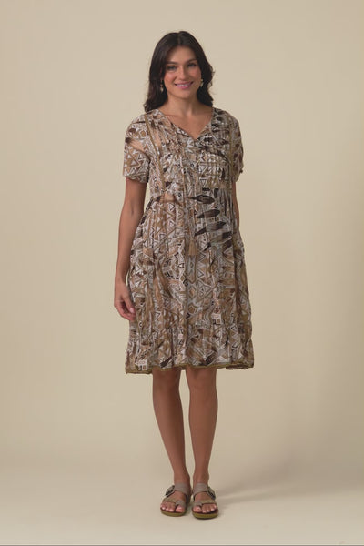 Marisol Brown Aztec Leaf Crinkle Cotton Dress