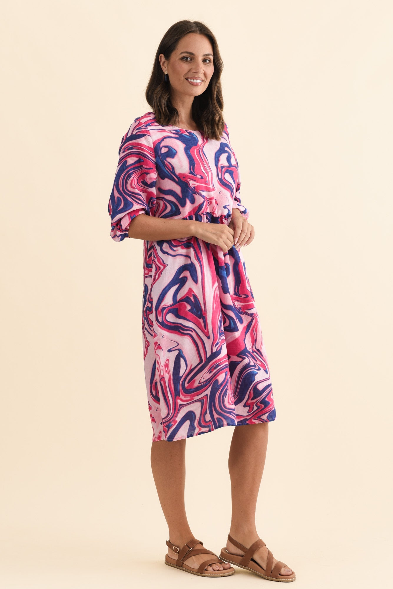 Nicolette Fuchsia Swirl Cotton Blend Sleeved Dress