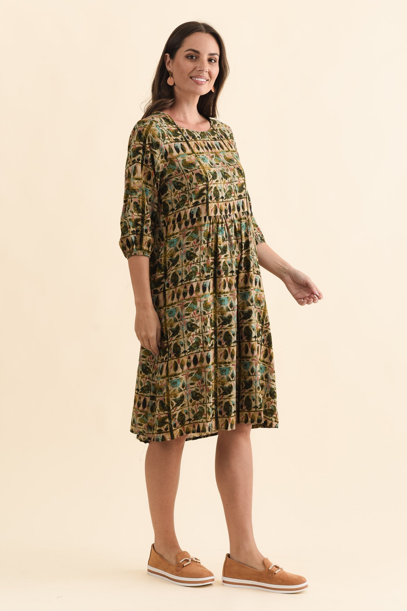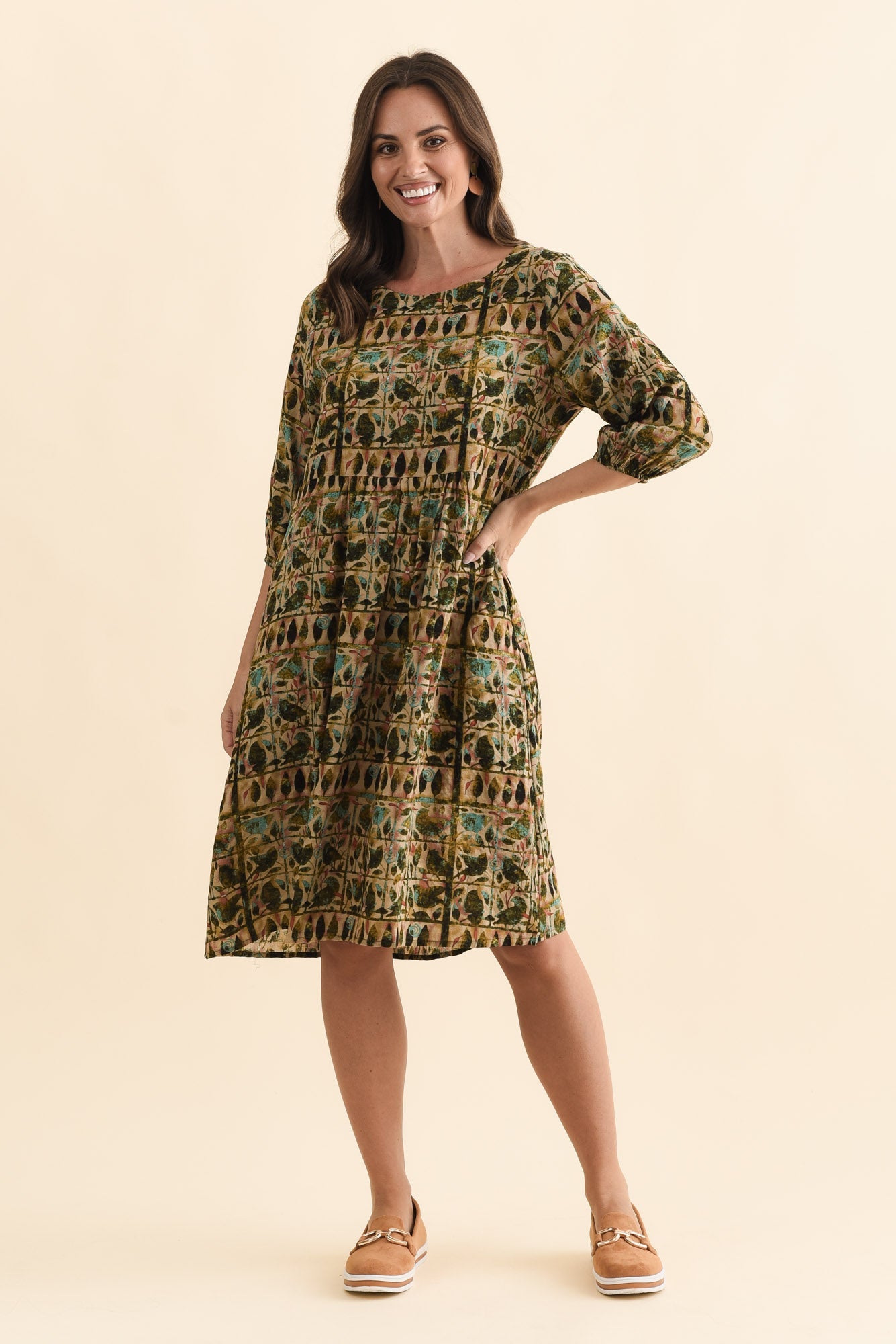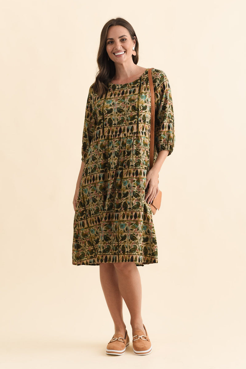 Nicolette Green Motif Cotton Blend Sleeved Dress