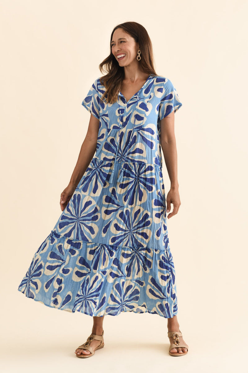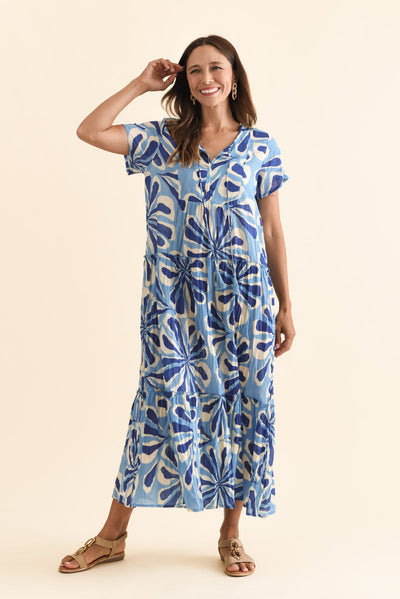 NONA BLUE DAISY CRINKLE COTTON MAXI DRESS