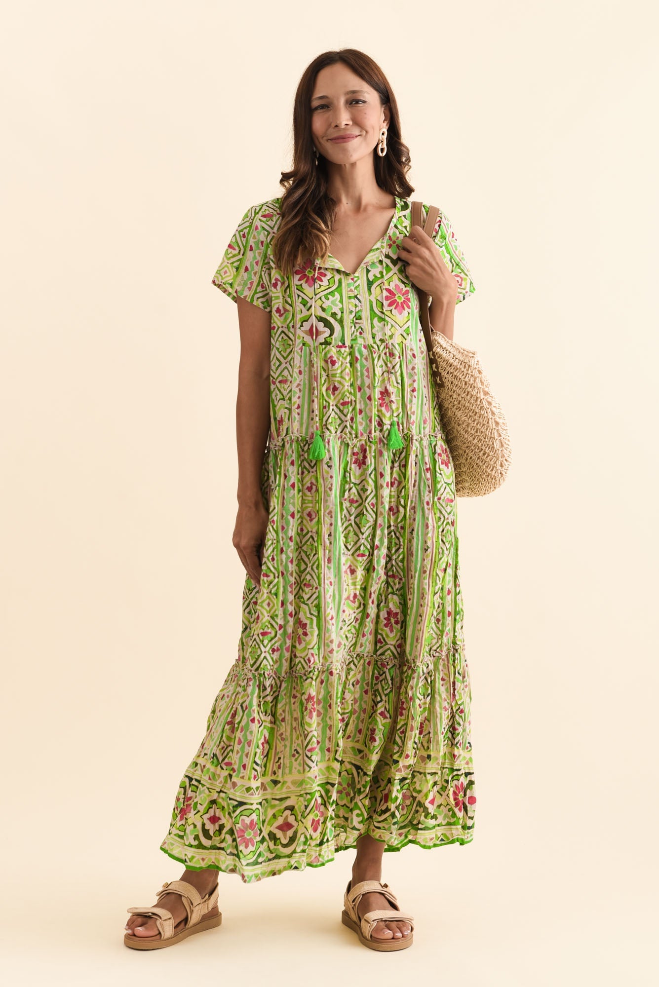 Nona Green Abstract Crinkle Cotton Maxi Dress