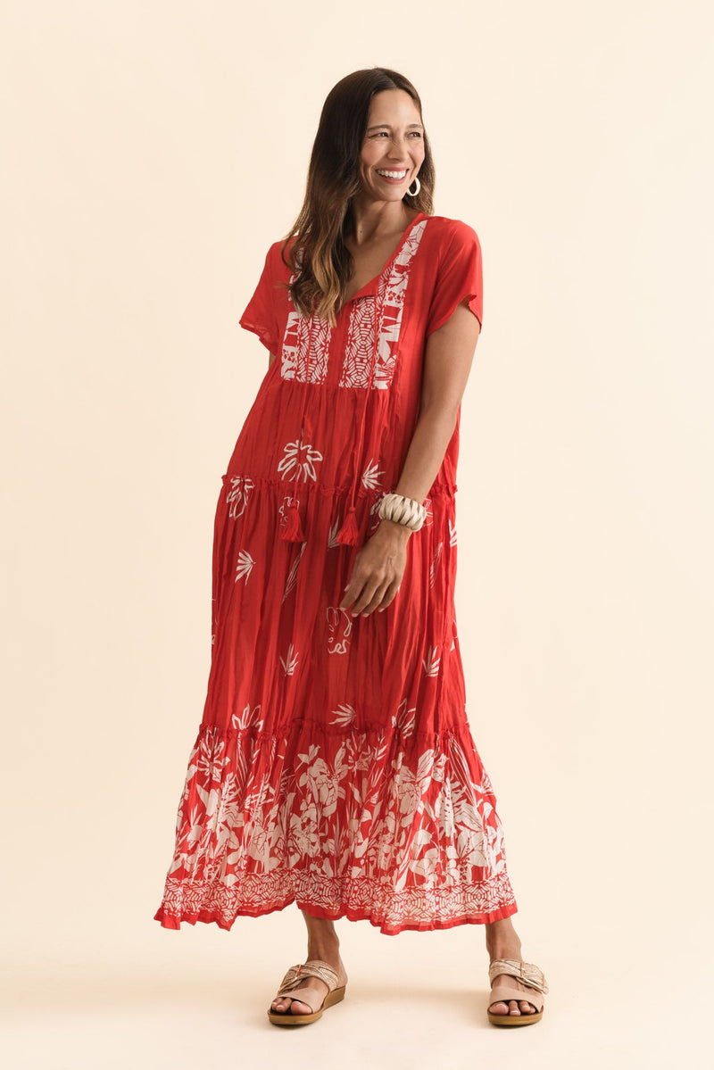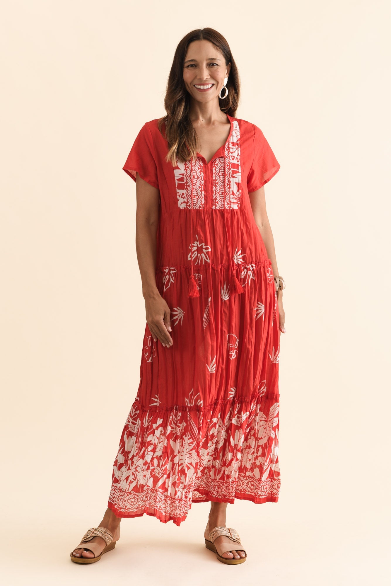 Nona Red Botanical Crinkle Cotton Maxi Dress