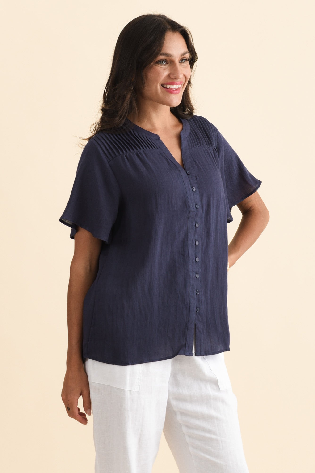 Ponny Navy Linen Blend Button Top