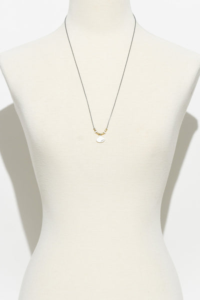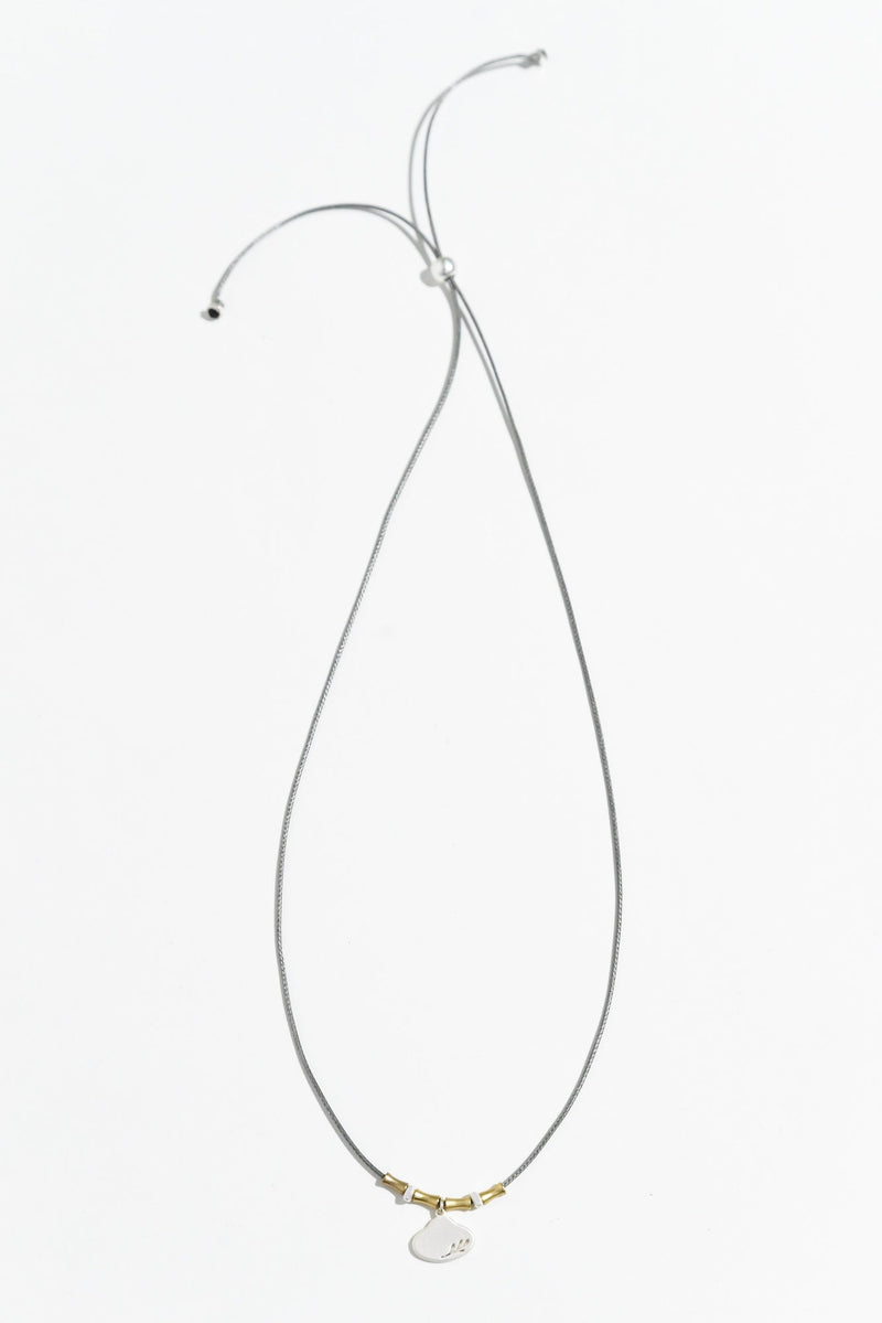 Small silver leaf pendant with delicate gold and silver beads on a grey thin rope necklace