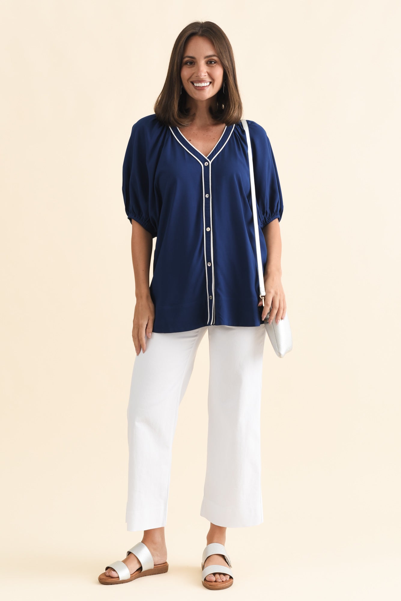 RIO REEF NAVY CONTRAST BUTTON BLOUSE