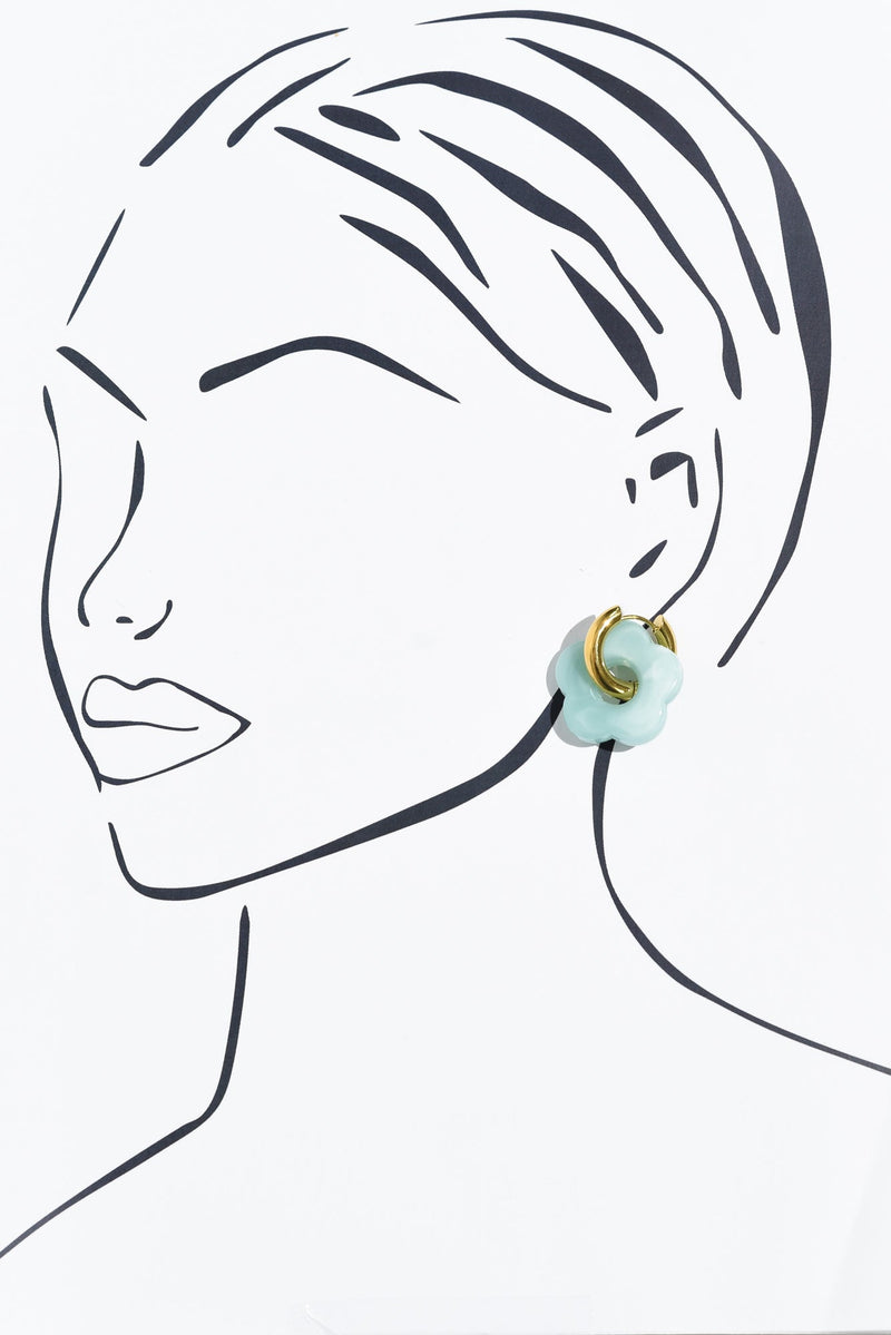 These gold hoop earrings feature a detachable blue acrylic flower, offering a refreshing twist to the classic hoop.