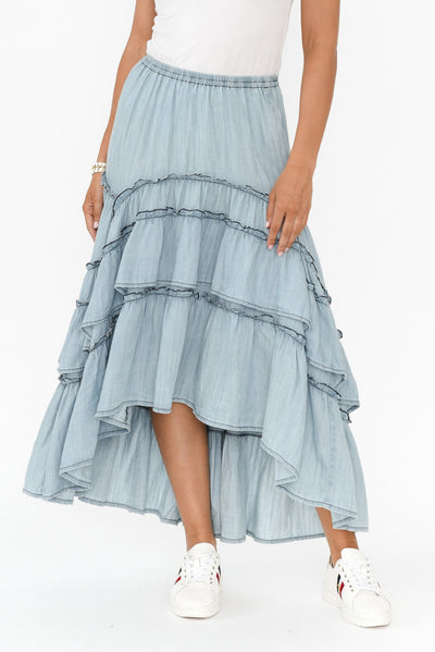 Sassy Light Blue Denim Tiered Skirt