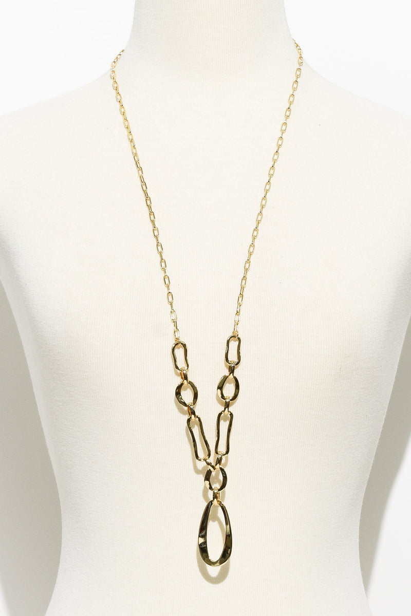A gold chain featuring larger, unique shapes linked together with an oval pendant