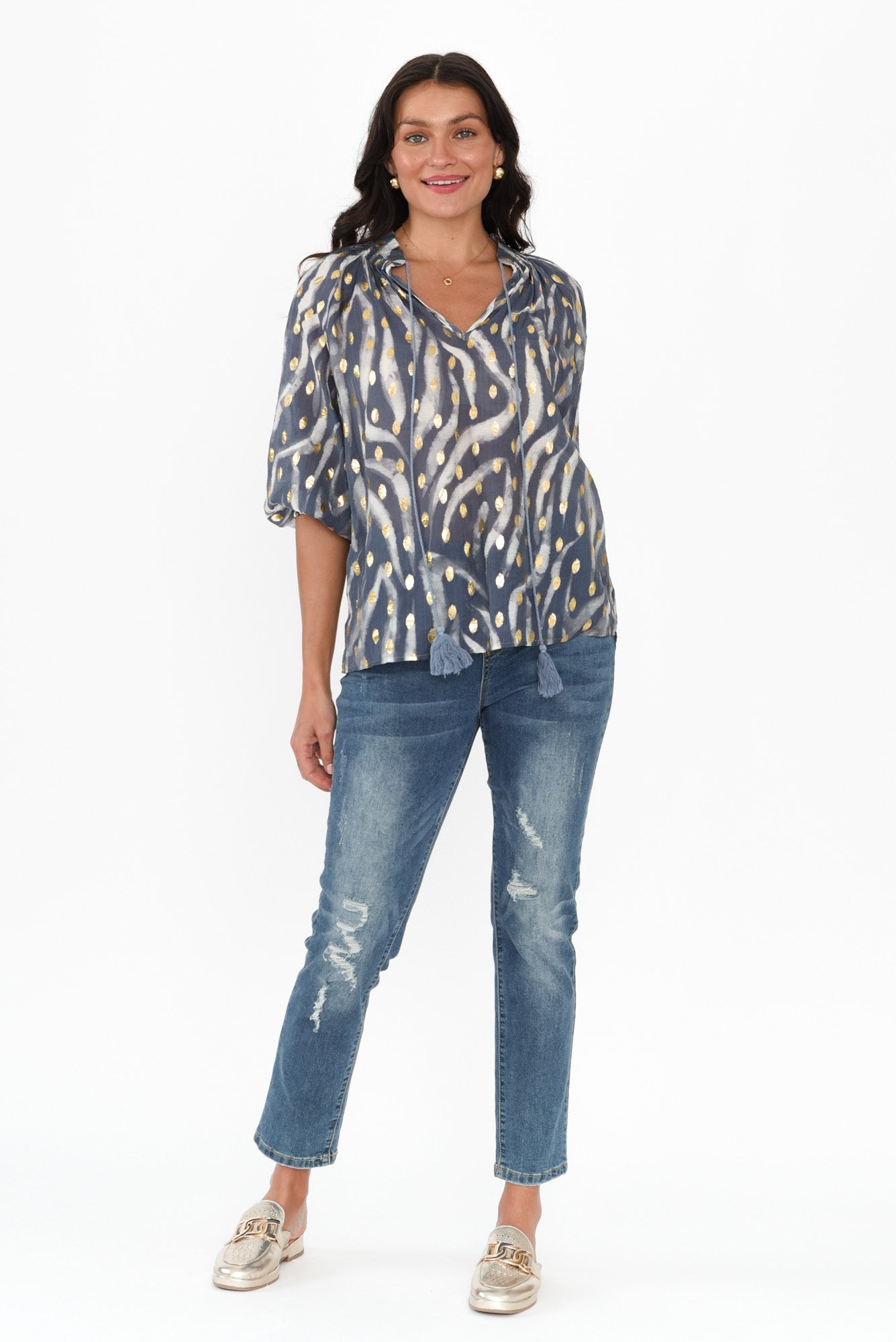 THEO NAVY SWIRL COTTON BLEND BLOUSE
