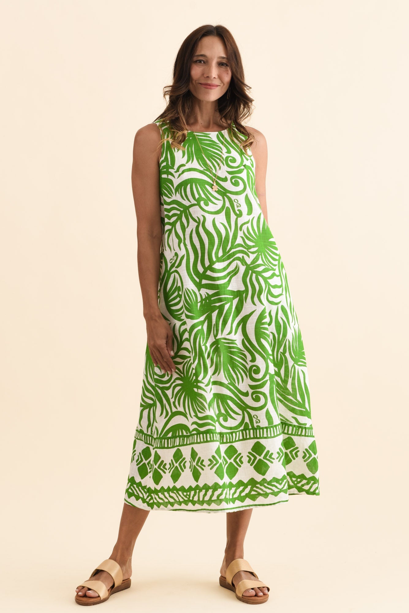 ZELDI GREEN LEAF COTTON MIDI DRESS